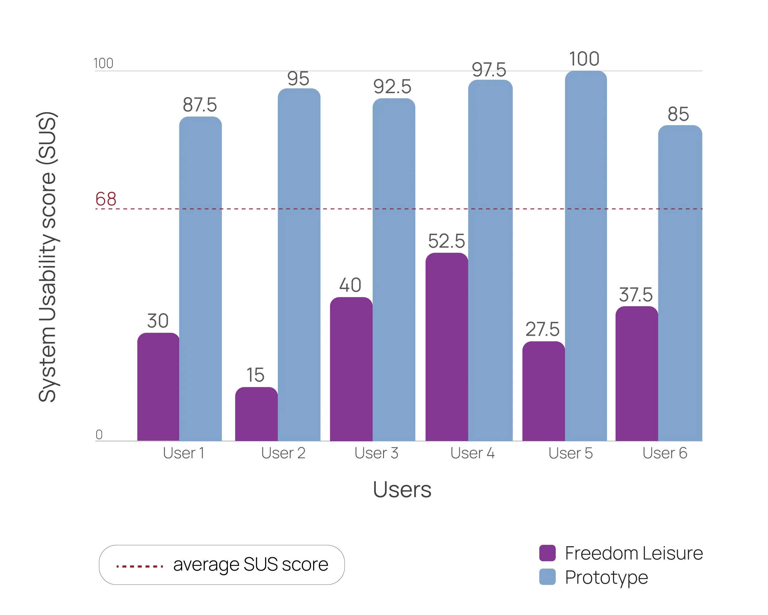 Users rated the improved prototype significantly higher in perceived usability on the System Usability Scale (SUS), with scores ranging from 85 to 100, compared to the Freedom Leisure website, which scored below average (15–52.5).