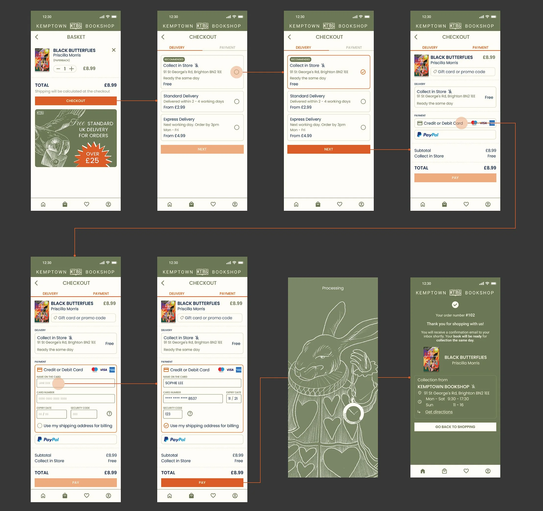 To start, I created wireframes for the key app screens necessary to test the checkout flow, including a homepage, a book page, a basket screen, and a three-step checkout process made up of delivery, payment and confirmation screens.